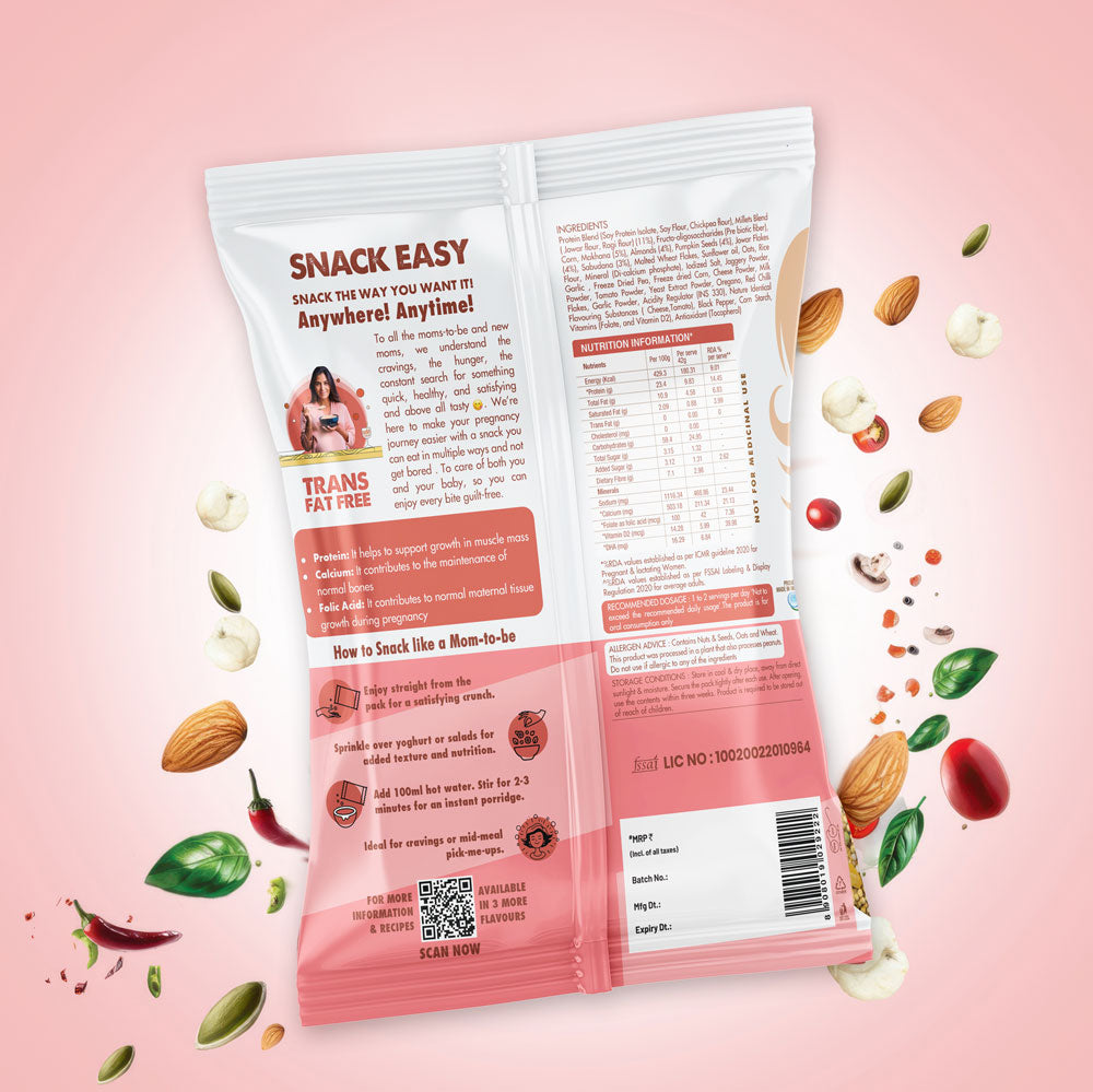 SnackEasy is a millet-based, healthy snack designed specifically for pregnant moms. It satisfies pregnancy cravings while being highly nutritious and versatile, making it the perfect guilt-free snack.