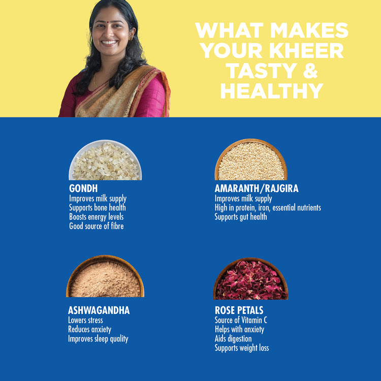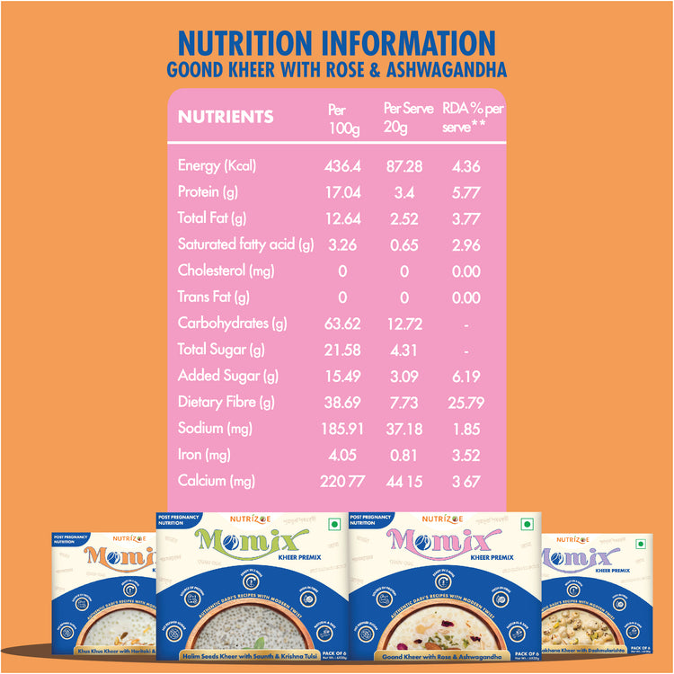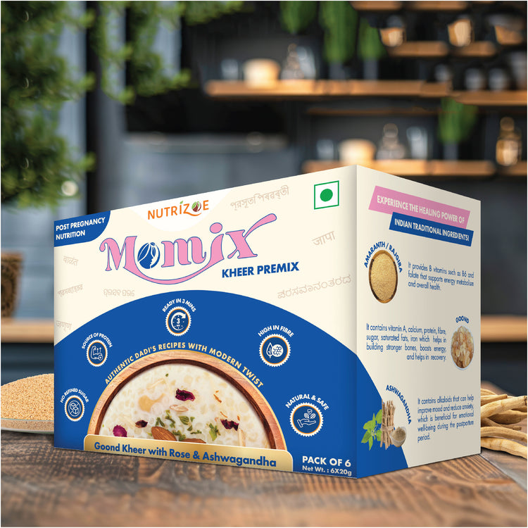 Momix Kheer is a postpartum recovery superfood designed to support new moms with their recovery journey. It features healing kheers packed with powerful natural ingredients like Kharik, Makhana, Halim Seeds, Saunth, Krishna Tulsi, and Dashmularishta.