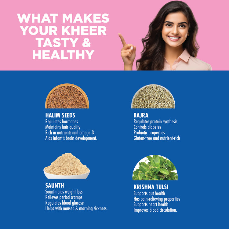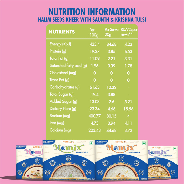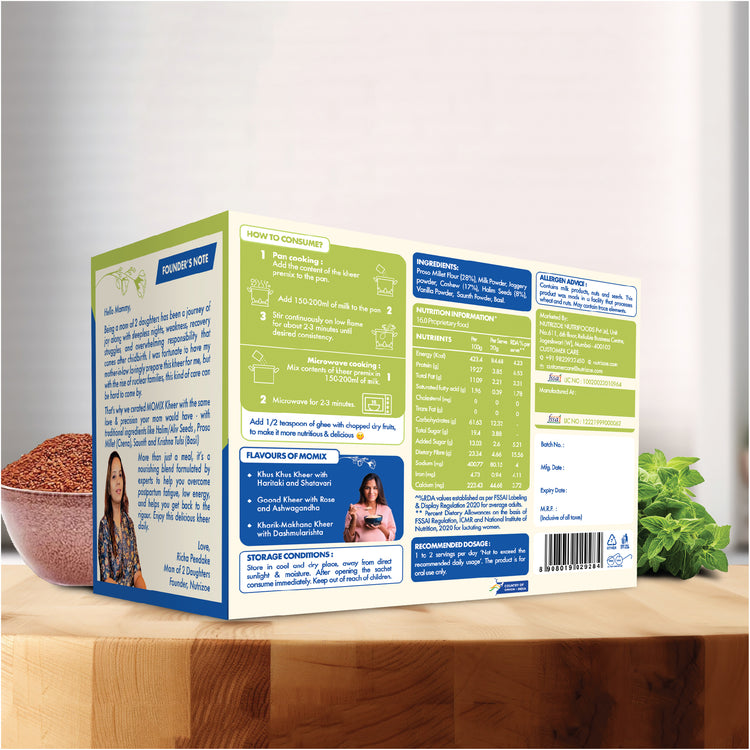 Momix Kheer is a postpartum recovery superfood designed to support new moms with their recovery journey. It features healing kheers packed with powerful natural ingredients like Kharik, Makhana, Halim Seeds, Saunth, Krishna Tulsi, and Dashmularishta.