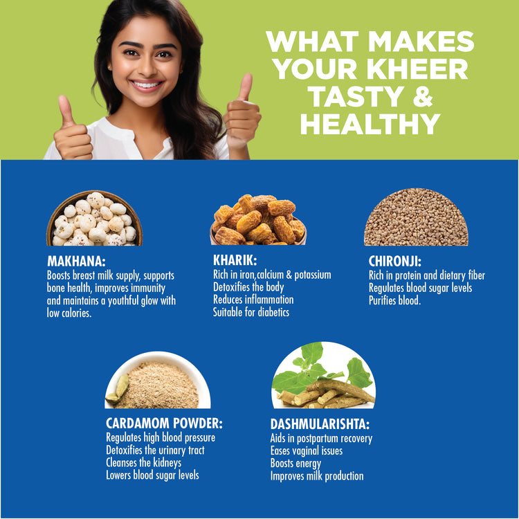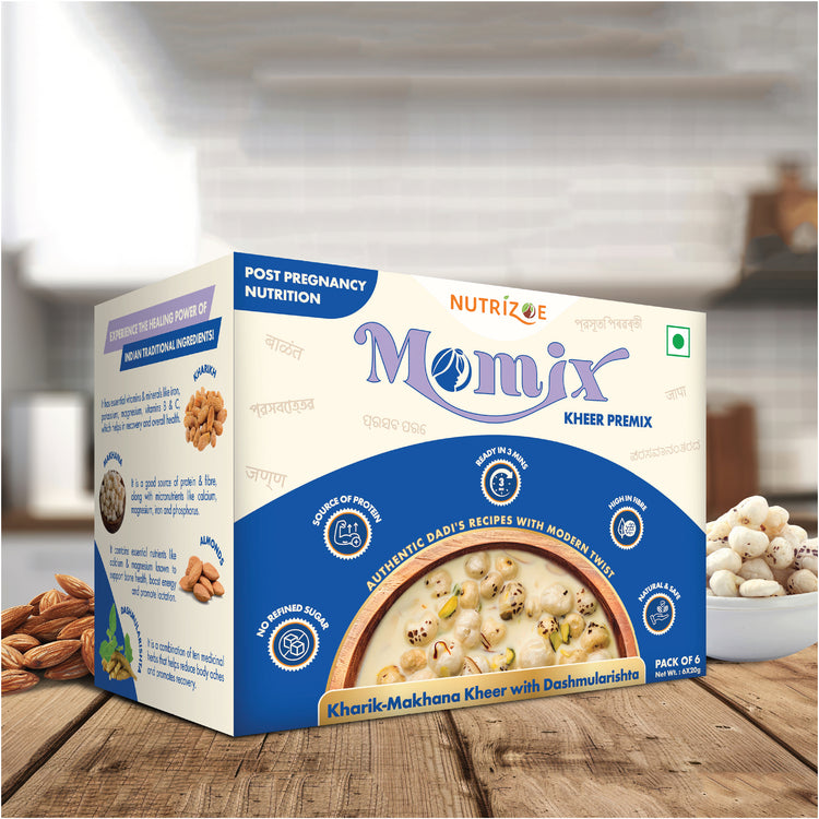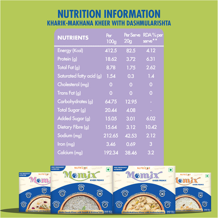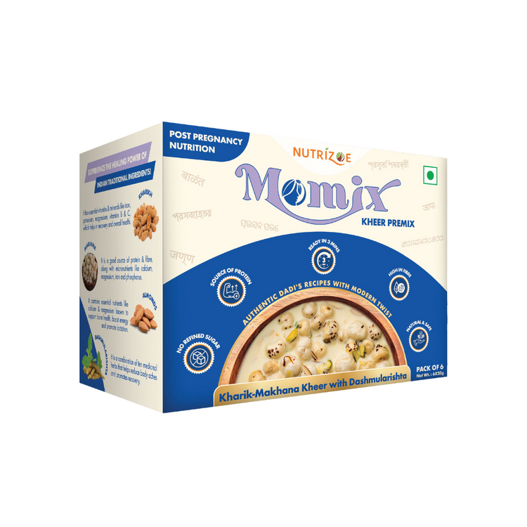 Momix Kheer is a postpartum recovery superfood designed to support new moms with their recovery journey. It features healing kheers packed with powerful natural ingredients like Kharik, Makhana, Halim Seeds, Saunth, Krishna Tulsi, and Dashmularishta.