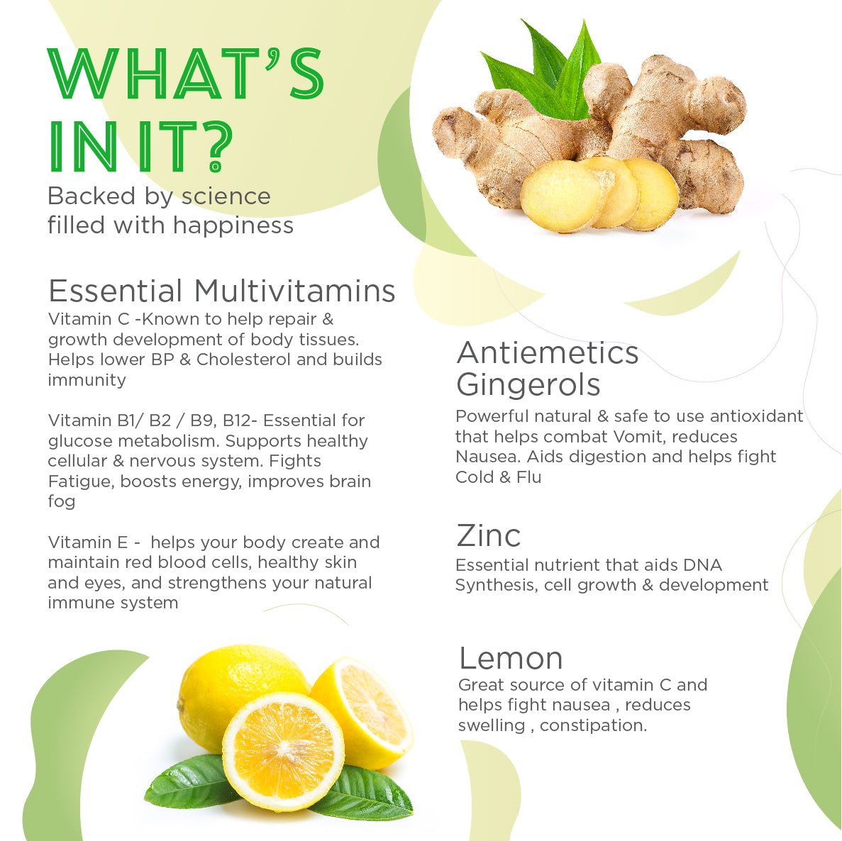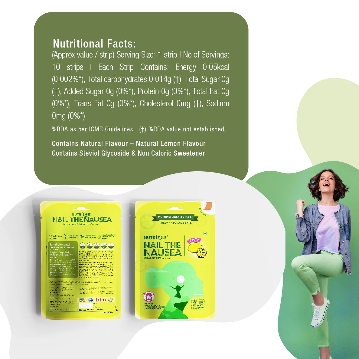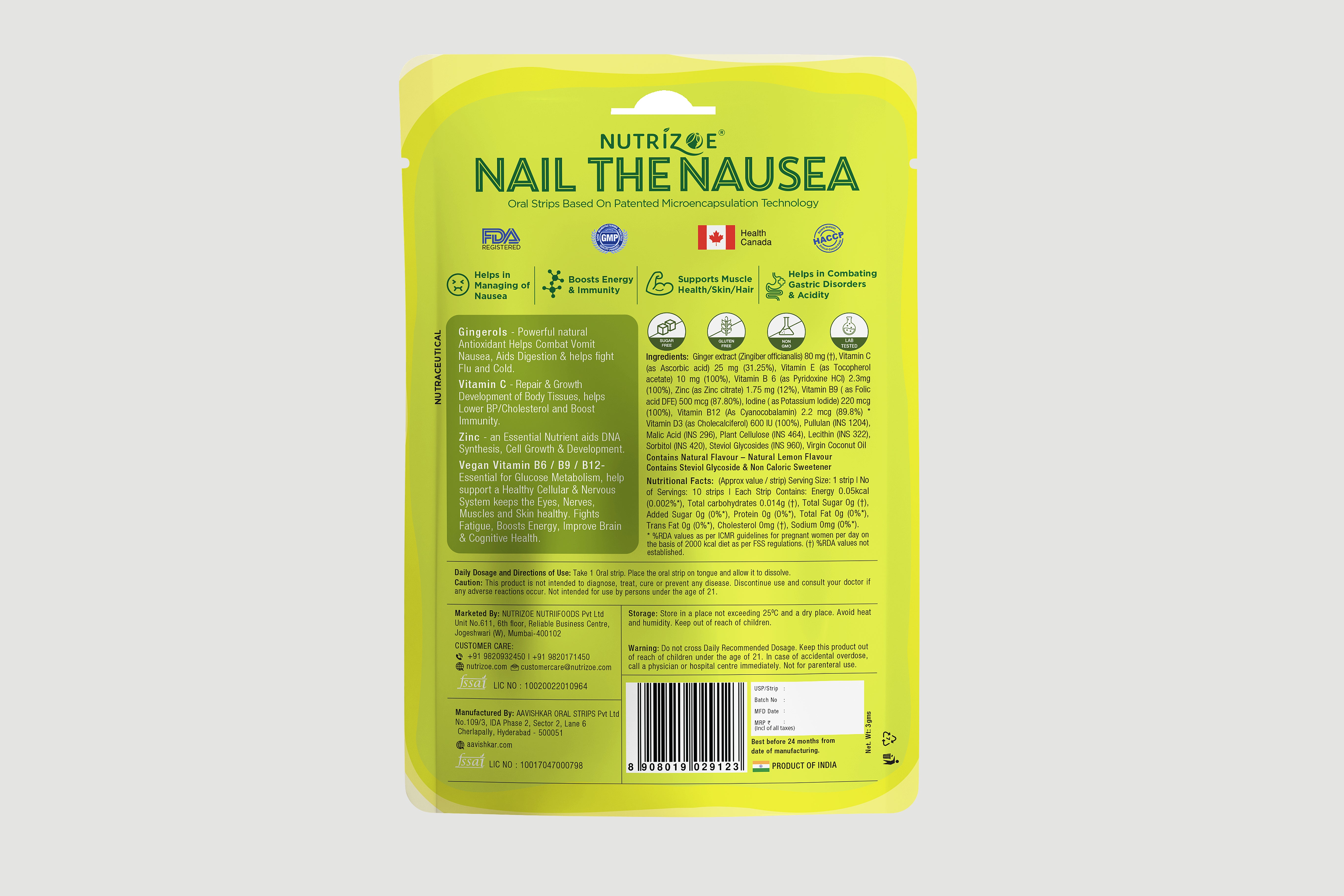 Nail the Nausea are fortified with key essential multivitamins like Vitamin B1,B2 ,B9,B12.Vitamin C ,Vitamin E & Zinc.