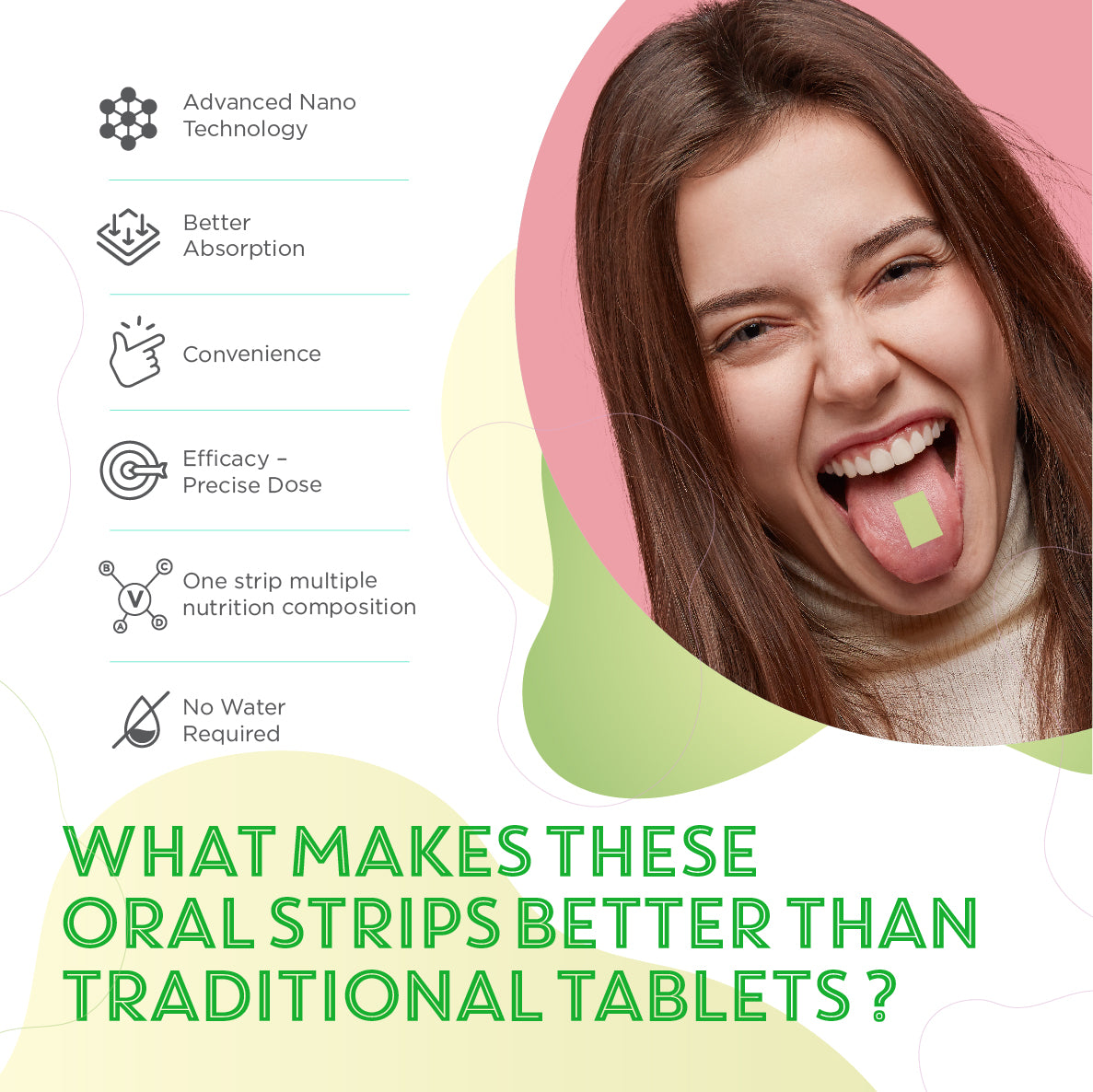 Buccal absorption better than other gut absorption, faster onset of action, better bioavailability than other dosage forms, 100% RDA with least number & quantity of excipients, Carbs and sugars - lesser than any other oral dosage form.