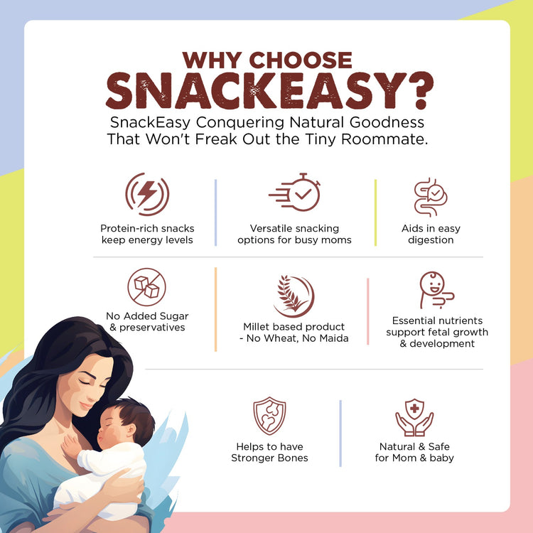 SnackEasy is a millet-based, healthy snack designed specifically for pregnant moms. It satisfies pregnancy cravings while being highly nutritious and versatile, making it the perfect guilt-free snack.