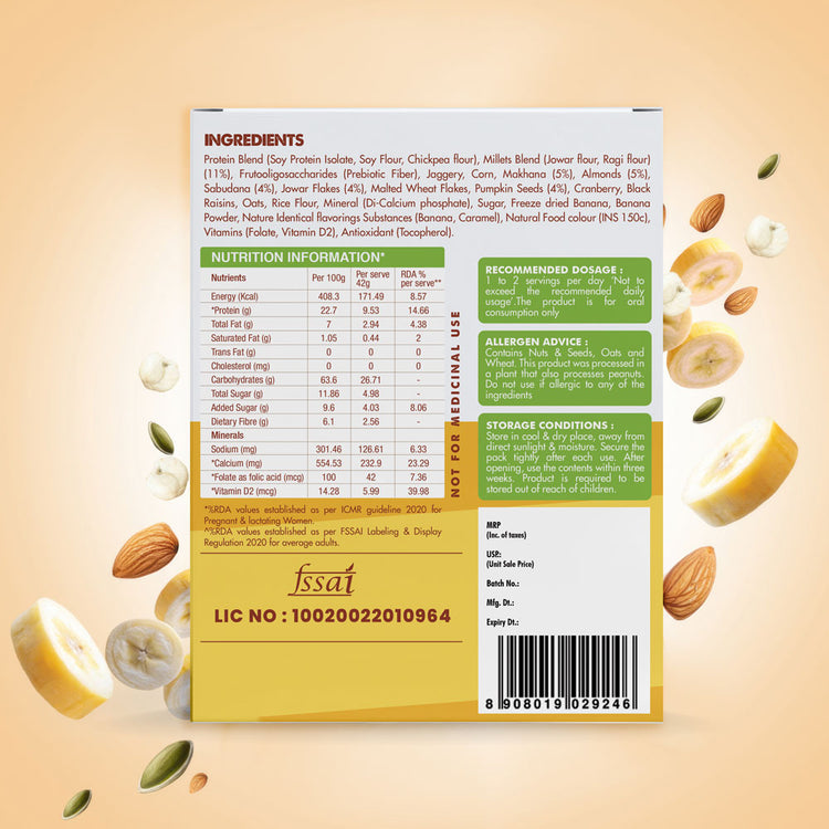 Makhana, Sabudana, Oats, Jowar flakes, Malted wheat flakes, Pregelatinized rice/oat flour, Soya flour, Soya Protein Isolate, Ragi, Chickpea, Jowar, Corn grit, DCP (Di calcium Phosphate), DHA (10%), Folate, Vitamin D2, Sliced Almonds, Pumpkin Seeds, Black Raisins, Jaggery, Cocoa Powder, FOS 95, Belgium Chocolate powder, Irish-Chocolate Flavour-powder, Tocopherol.